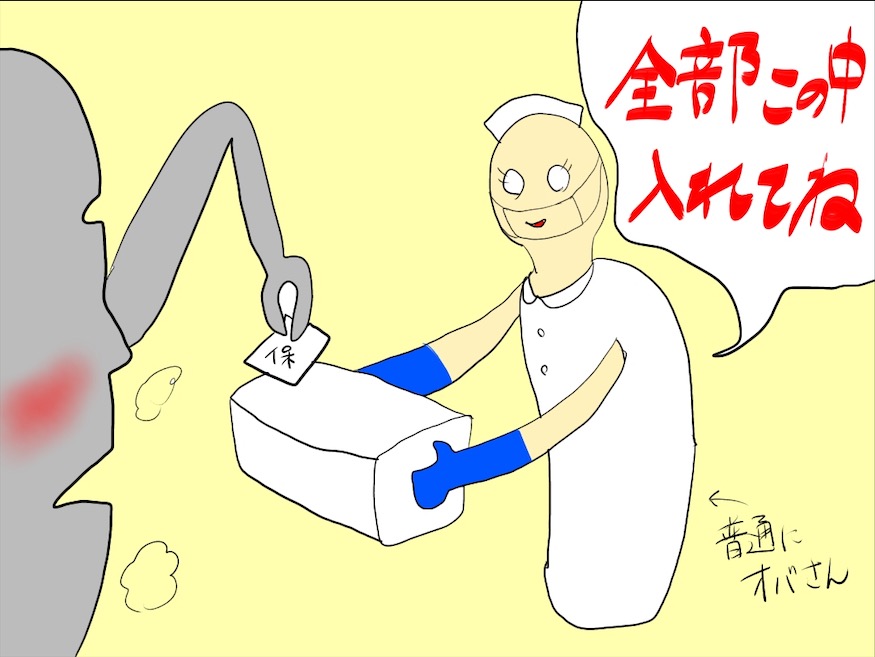 診察券と保険証や診察代などをその看護師さんがもつ容器へ入れますが、看護師さんは入れたものに一切触りません