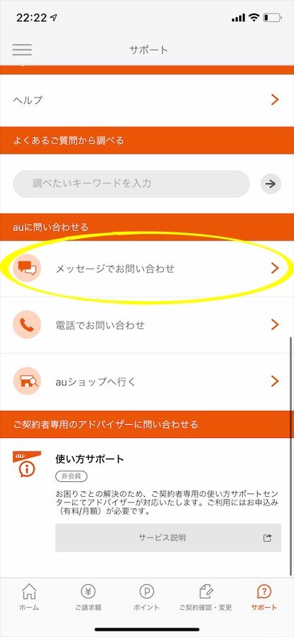 下にスクロールして「auに問い合わせる」の中の「メッセージで問い合わせ」を選びましょう。