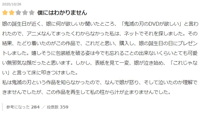 これは鬼滅の刃をパロったAV作品のレビューなのですが、早い話が嘘松ですし狙いすぎています。約8割が参考になったというレビューですが、筆者はこのレビューに参考になったを付けた人とは友達になれないと思います。