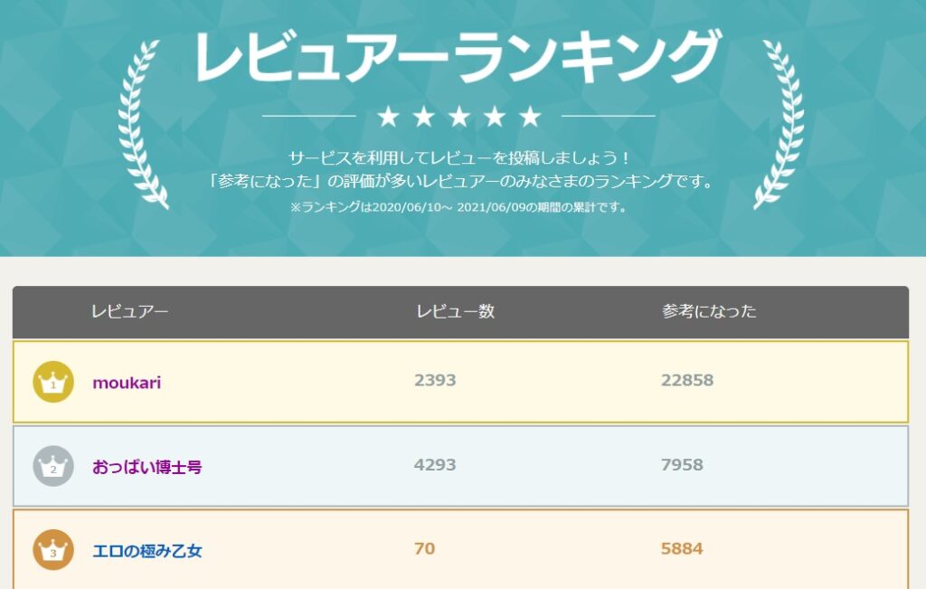 ちなみにFANZAではAVのレビューに”参考になった”ボタンがついており気に入ったレビューに投票する機能がついています。さらにその参考になった数が多い人を上位レビュワーとしてランキングがつけられているんです!