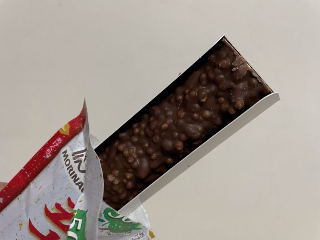 一思いに力を込めて噛み切る、ちょっとビターなチョコレートの味が口いっぱいに広がり、ジャリジャリとした米パフの食感が楽しい
