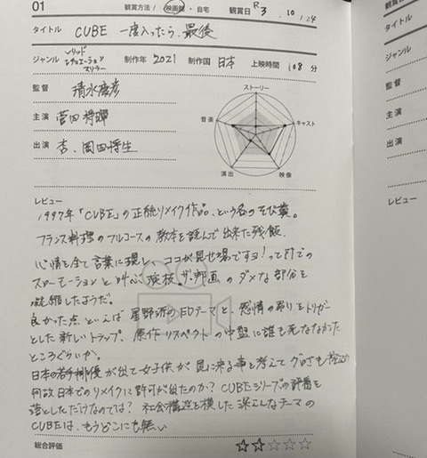 実際に鑑賞日や映画レビューを書いてみました、レビューを書き入れる欄は広めにとられているので実際に映画館で鑑賞した作品は映画の半券を張り付けることもできます