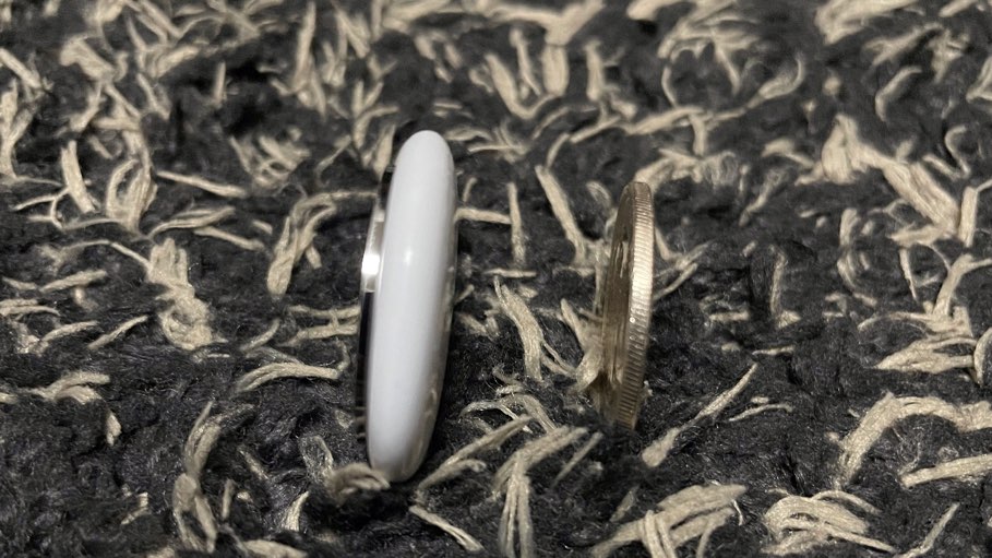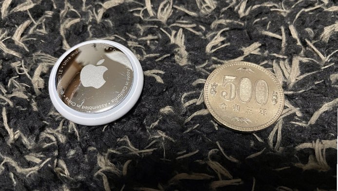 そんでもって大きさは思ったより小さい、500円硬貨と比べてみてもAirTagの方がわずかに一回り大きいくらい。