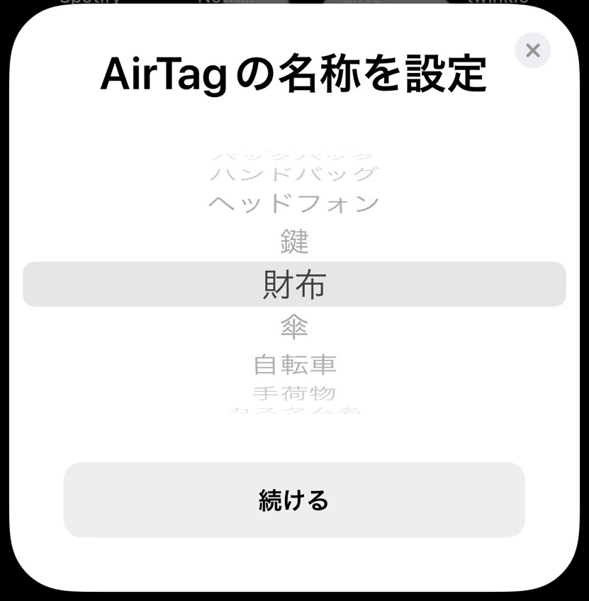 「接続」をタップすると次にAirTagの名称を設定することが出来る、筆者は財布に入れて使用するため財布という名称を付けることにした